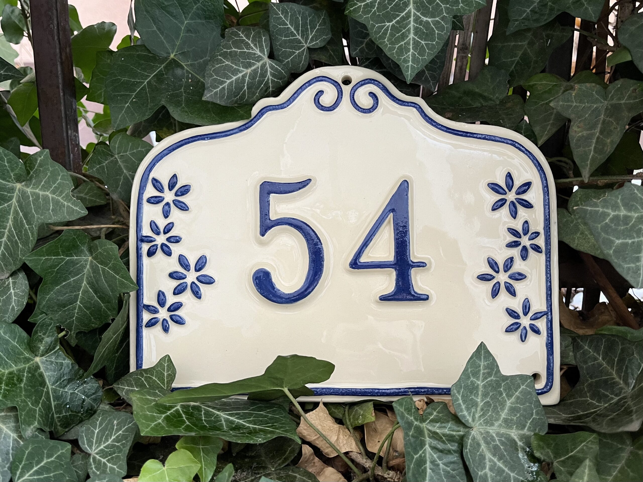 Keramické domovní číslo dle Vašeho přání s vystouplými čísly a s plastickou dekorací po stranách. Velikost menší A4 – 25 x 20 cm, tři otvory pro zavěšení. Barevnost můžeme přizpůsobit Vašemu domu či chalupě. Výroba trvá cca 6 týdnů.