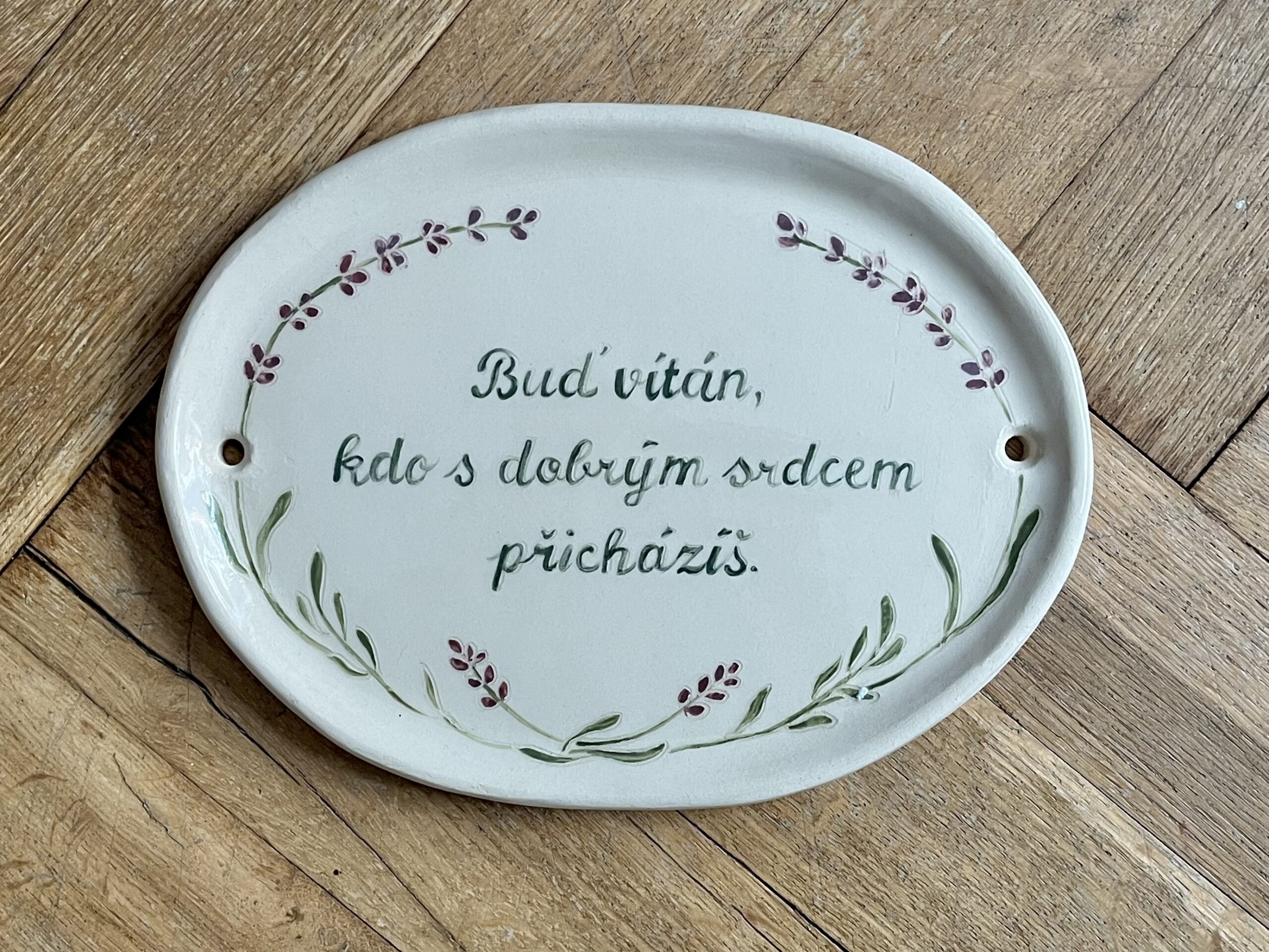 Keramická domovní cedulka Buď vítán. Ovál šířka 212 mm. Dva otvory pro zavěšení.