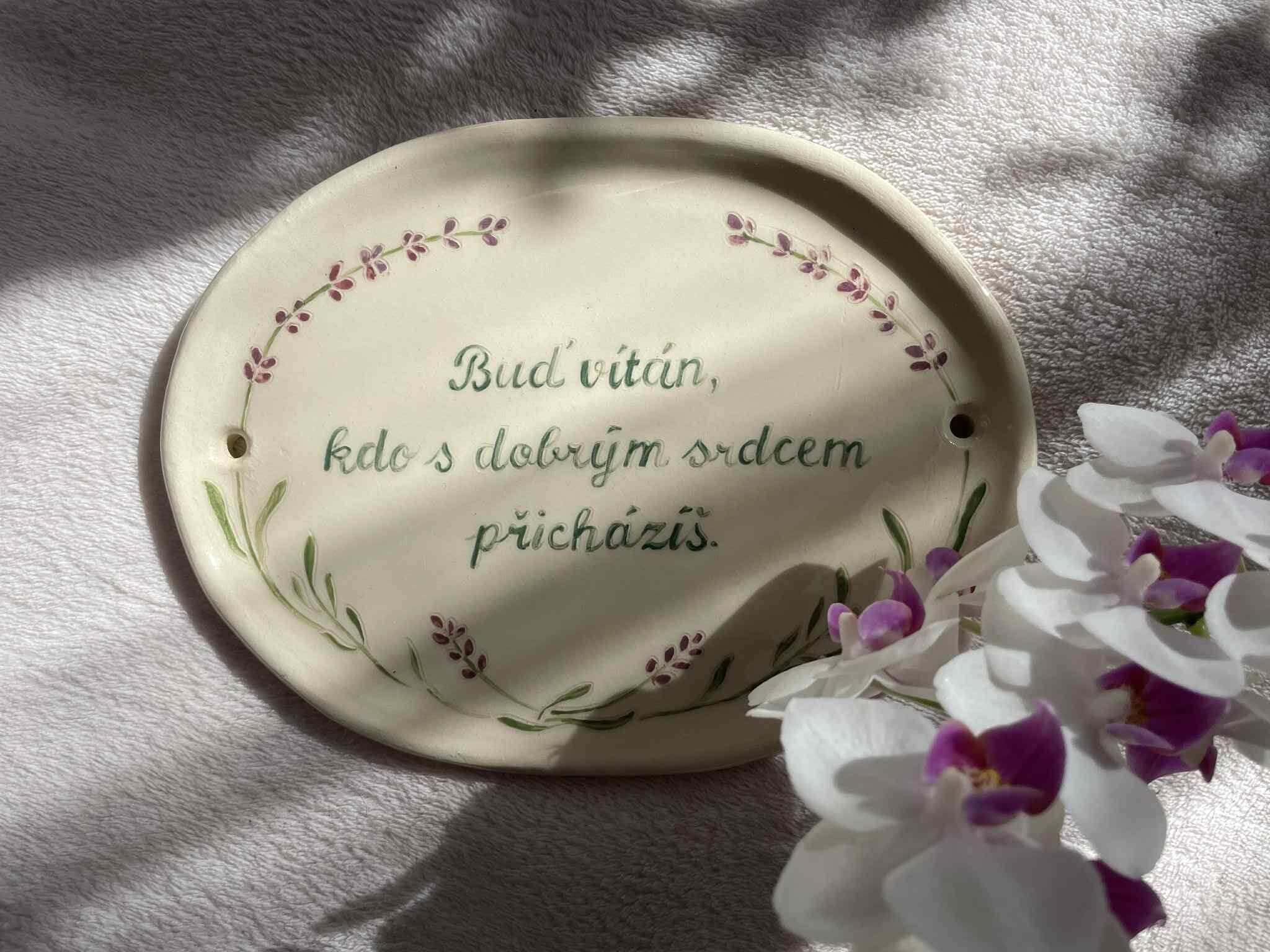 Keramická domovní cedulka Buď vítán. Ovál šířka 212 mm. Dva otvory pro zavěšení.