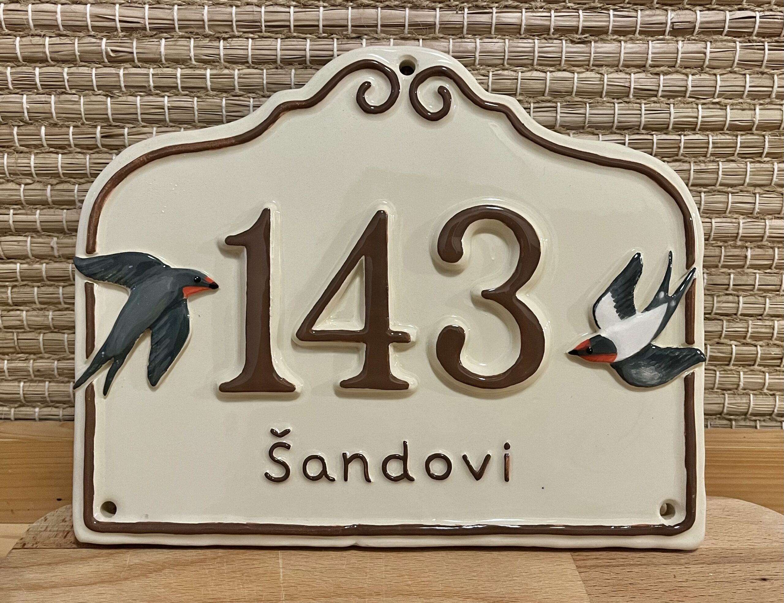 Keramické domovní číslo dle Vašeho přání s vystouplými čísly a s reliéfním dekorem po stranách. Velikost menší A4 – 25 x 20 cm, tři otvory pro zavěšení. Barevnost můžeme přizpůsobit Vašemu domu či chalupě. Výroba trvá cca 6 týdnů.